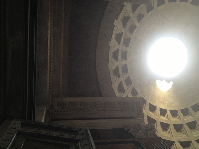 Looking up into the coffers (hollowed out squares) and oculus (opening) in the dome.