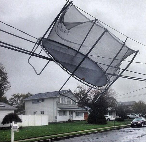 I laughed the other day when I saw that one of the people down the street from us had used a single rope to link a trampoline like that to a big oak tree. It looked silly then. Now it doesn’t. (And I’ll confess that my canoe is tied to a tree.)